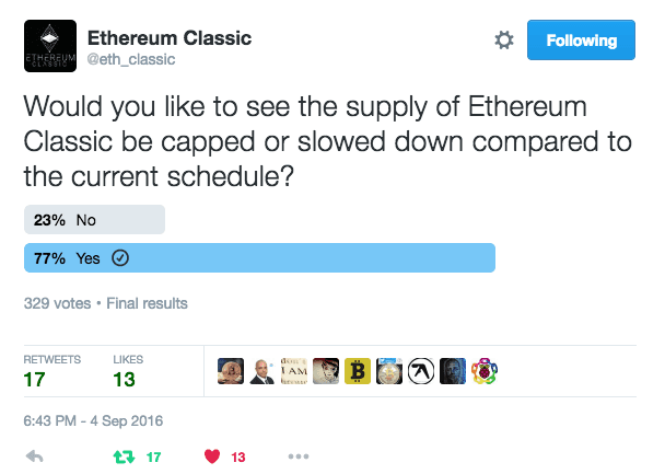 The want and need for change in the money supply even had 77% support in one poll conducted by the Ethereum Classic Twitter Account.