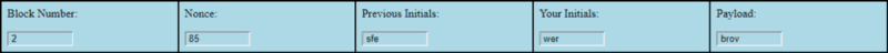 - Blocks consist of five fields: block numbers, nonces, previous initials, player initials, and, payloads.