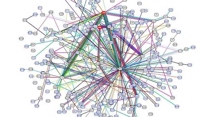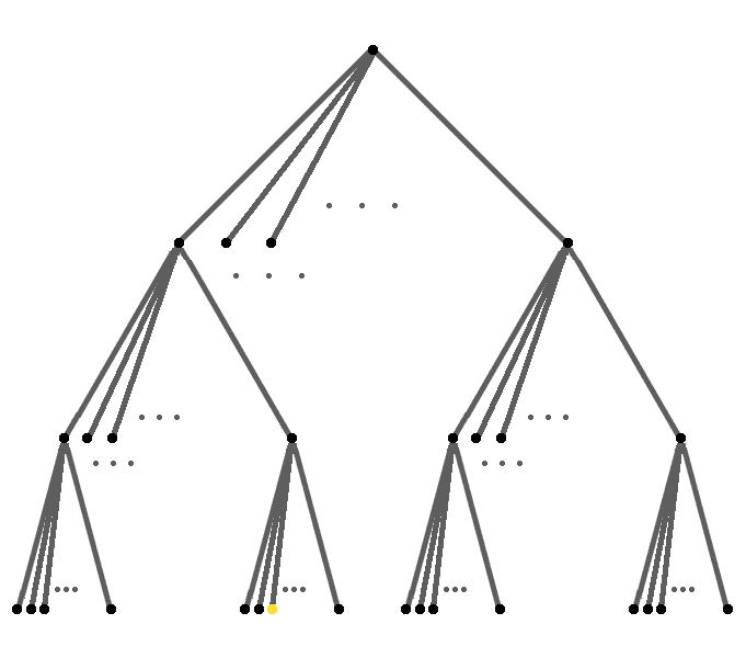 The diagram above represents a trie where each node connects to 16 nodes below it. Note that each line segment will add one of 16 possible values (nibbles) to the keys. Therefore, the yellow dot corresponds to the key with the hexadecimal representation "0x0f2". The previous trie diagram represented 15 nodes. This one represents 4369 nodes!