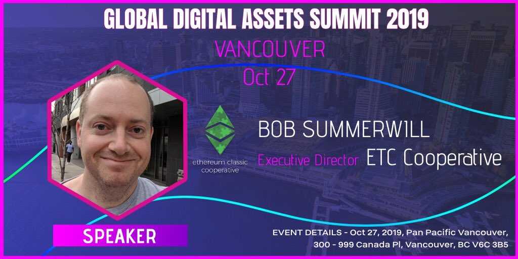 19th October 2019 – Vancouver, Canada – The ETC Cooperative today announced that Bob Summerwill, its Executive Director, will be speaking at the Global Digital Assets (Vancouver) Summit 2019 on Sunday 27th October 2019 on "What's Happening with Ethereum Classic?"